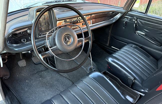 Kaross & Lack: En tidigare ägare renoverade bilen för drygt 10 år sedan. Då omlackerades bilen i originalkulören DB158 Weissgrau och fick plåtskador åtgärdade, bland annat i golv och baklucka. Lacken håller i dag brukskvalitet, dock utan show-finish. Det finns några knappnålsstora ytrostprickar och små repor i glasrutorna, men inga stenskott eller lackblåsor. Karossen presenterar sig i genomgående bra skick där kromdetaljerna är bra, dock med visst åldersrelaterat inslag av oxid på vissa lister. Samtliga lyktglas är hela.