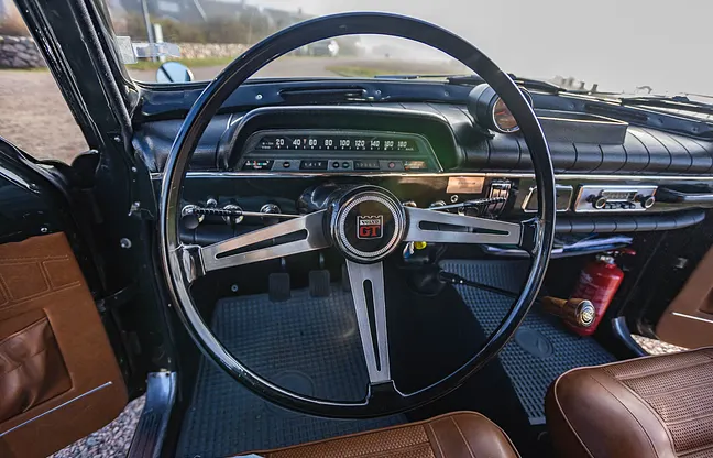 Interiör Stolar och klädsel beskrivs som i nyskick med ny stoppning. Instrumentpanelen uppges vara i utmärkt skick. Innertaket beskrivs som bra. Ratt, reglage och knappar uppges vara utan anmärkning.