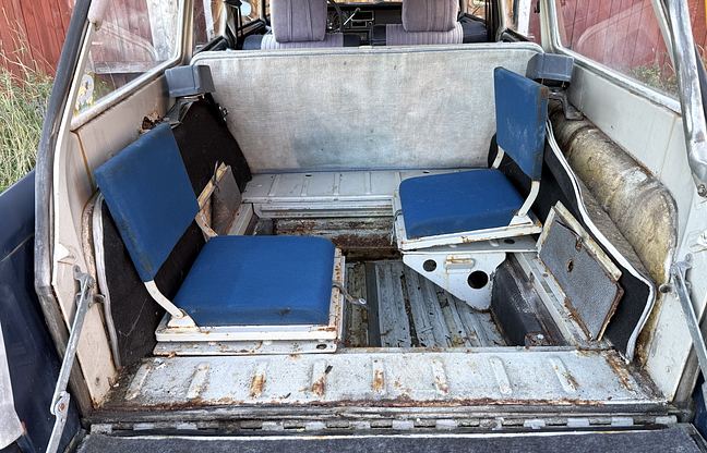 Kaross och exteriör: Bilen har tidigare rostlagats och karossens stomme är frisk, men viss rost har återkommit i dörrarna, bakre hjulhus, bagageutrymmet vid barnstolar samt under vindrutan. Skärmar och baklucka är i gott skick utan större rostangrepp. Flera paneler har matta partier och sprickor i lacken, men inga bucklor eller större repor förekommer.