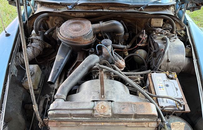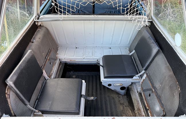 Interiör: Klädseln är original – svart vinyl/galon – men har sett bättre dagar; dörrpanelerna har släppt, sätenas sömmar har spruckit på flera ställen. Tygmattorna är hela men gummimattorna har torrsprickor. Framsätena har överdragsklädsel som är solblekt. Instrumentpanelen har ett par torrsprickor, rattkransen i plast har bubblor och invändiga dörrhandtag har noppigt krom. Innertaket är direkt limmat mot yttertaket och visar missfärgningar.