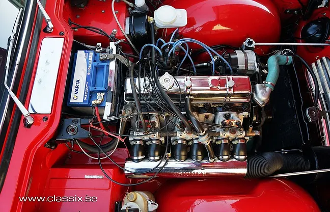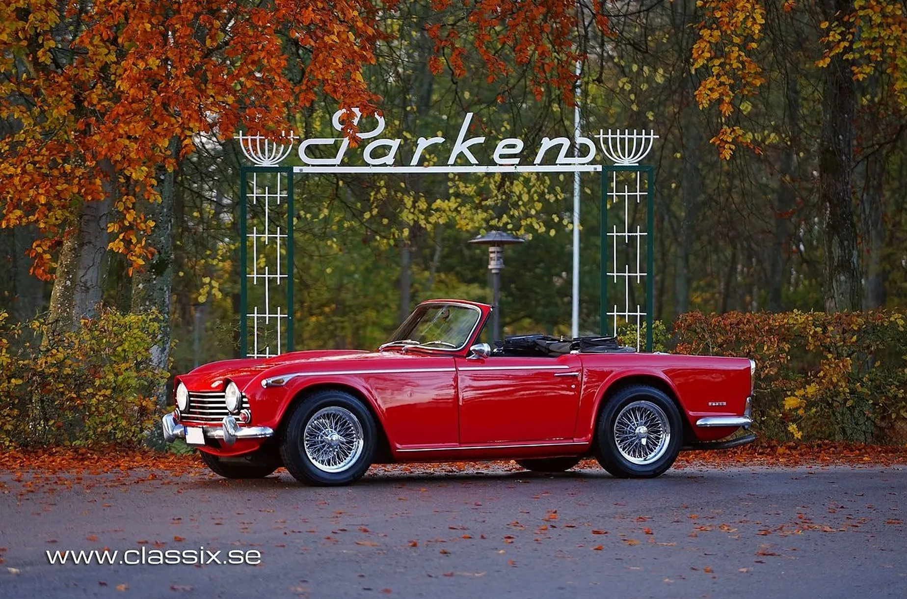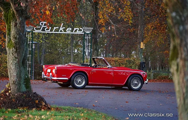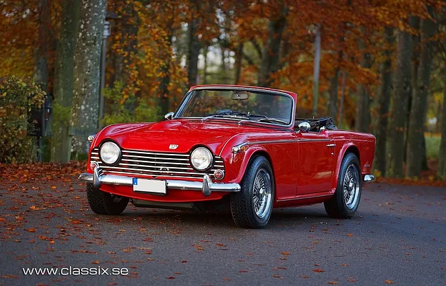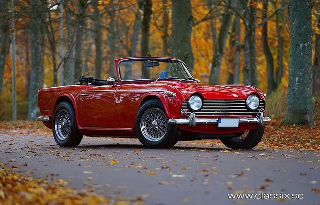 TR5: Der Triumph TR5 ist ein seltener britischer Sportwagen, 947 Exemplare zwischen 1967 und 1968. Er verfügt über einen 2,5-Liter Reihensechszylinder mit 150 PS und Einspritzung – der erste seiner Art bei einem britischen Serien-Sportwagen. Dieses Fahrzeug ist im klassischen Signal Red lackiert, mit breiteren Speichenrädern und einer Karosserie in gutem Zustand. Der Innenraum hat schwarze Vinylsitze, Sicherheitsgurte und ein etwas abgenutztes, aber funktionsfähiges Verdeck. Der Motor klingt dank einer Edelstahlauspuffanlage fantastisch. Gekoppelt ist er mit einem Vierganggetriebe mit Overdrive; zusammen ergibt das beeindruckend lange Übersetzungen.