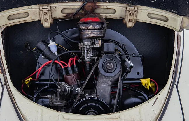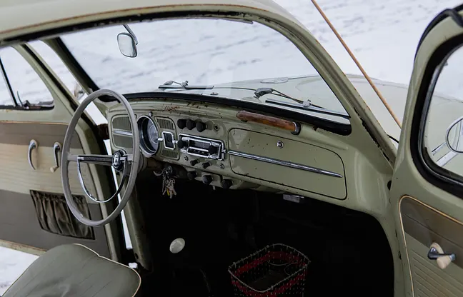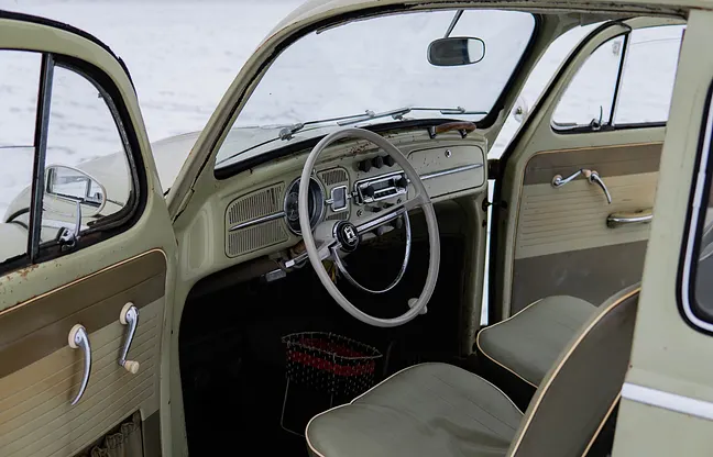In the late 1960s, the car was updated with a larger fuel tank and thus also a fuel gauge. It also received newer taillights, license plate lighting on the engine compartment lid and front turn signals. The car was brought out again in 1983 for inspection and was then given its current registration number. It was then put aside on 1 April 1985 and brought out in 2023, when the seller took steps to get it started, working and inspected. This is an honest, patinated example with a well-documented history and a clear time capsule feel.