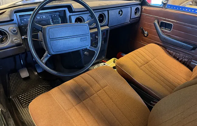 Interior: Original interior in good used condition according to the seller. The seats are worn but mostly intact, with cracks on the sides. The dashboard has a crack. The headliner is good. The steering wheel, controls and buttons are in good condition.
