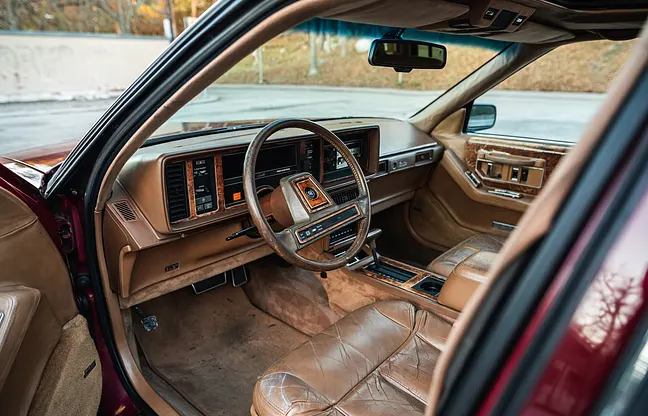 Interior : The headliner has recently been replaced. The attachment is faulty and the roof is stained. The leather upholstery has several dry cracks and the leather on the right front seat needs seam repair. The rear seat is stained. The imitation wood panels have cracked and peeled. The steering wheel is rated by the seller to be in about 80 percent condition and the buttons are said to look fresh. The ventilation grille by the windshield is cracked.