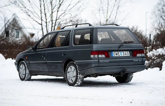 The Peugeot 405 was introduced in 1987 with a design by Pininfarina and was awarded the European Car of the Year award in 1988. The Break, the estate version, combines the light and precise chassis balance that has made the 405 appreciated by drivers with a practical and spacious cargo volume. The SRI version is the more well-equipped petrol version and is appreciated for its harmonious drivetrain and low weight and good cargo space. This 405 comes with the 1.9-liter engine of approx. 120hp/170nm coupled to a 5-speed manual gearbox.