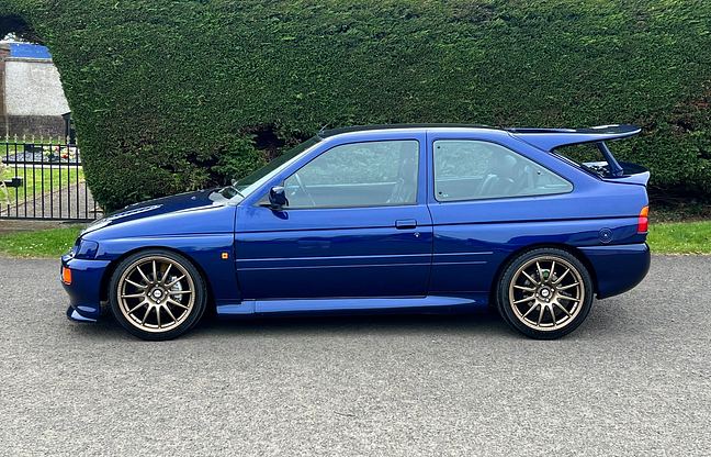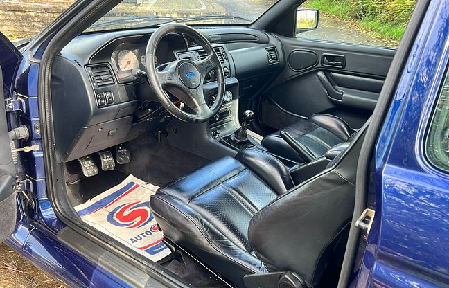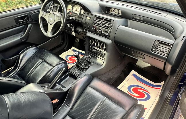 This example is a Ford Escort RS Cosworth, built in December 1992 but as a 1993 model year, in the rare launch colour Pacifica Blue, with leather upholstery and electric windows, but without a sunroof. The car belongs to the sought-after Big Turbo series and a total of 7145 Escort RS Cosworths were built between 1992 and 1996.