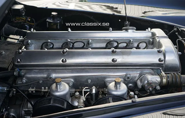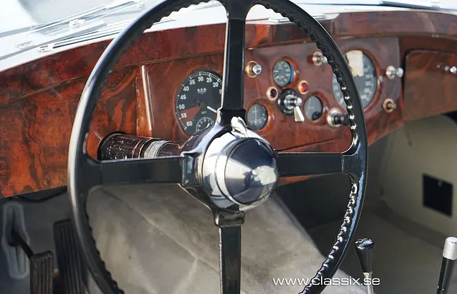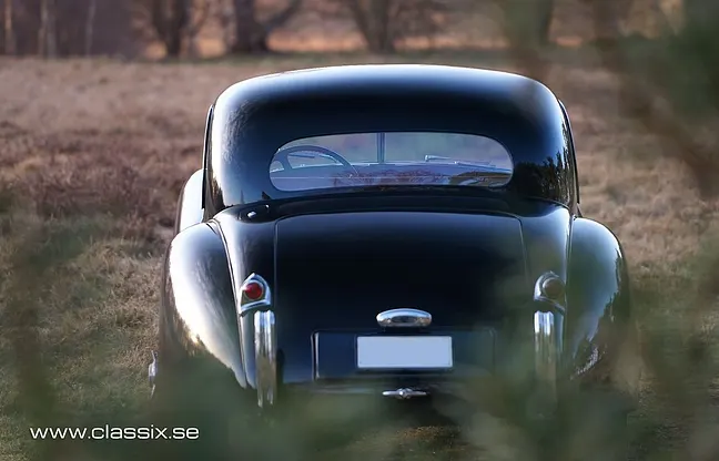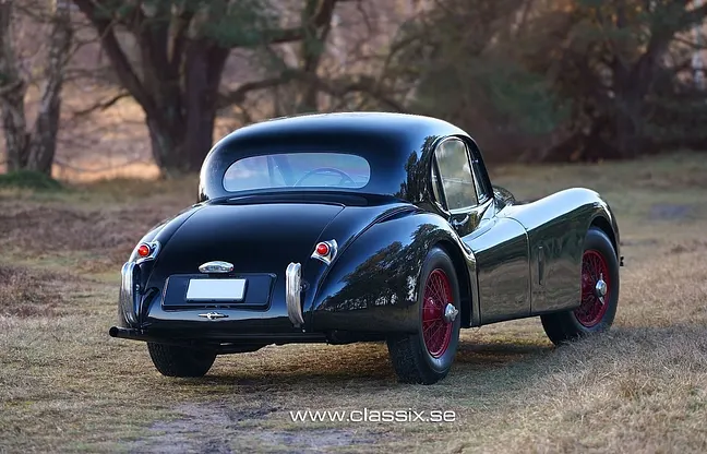The 1952 Jaguar XK120 Coupe is a beautiful classic with a 3.4-liter straight six-cylinder engine delivering 162 hp. This matching-numbers car, imported from the USA to Sweden in 2012, has been sparingly used and kept in a museum. The exterior in black with red wire wheels gives a sporty impression, and the car is in very good condition, both on top and underneath. The interior, with leather seats and wood panels, is also in excellent condition. It has recently been serviced, received new fuel lines and a stainless-steel exhaust, and is now ready to drive.