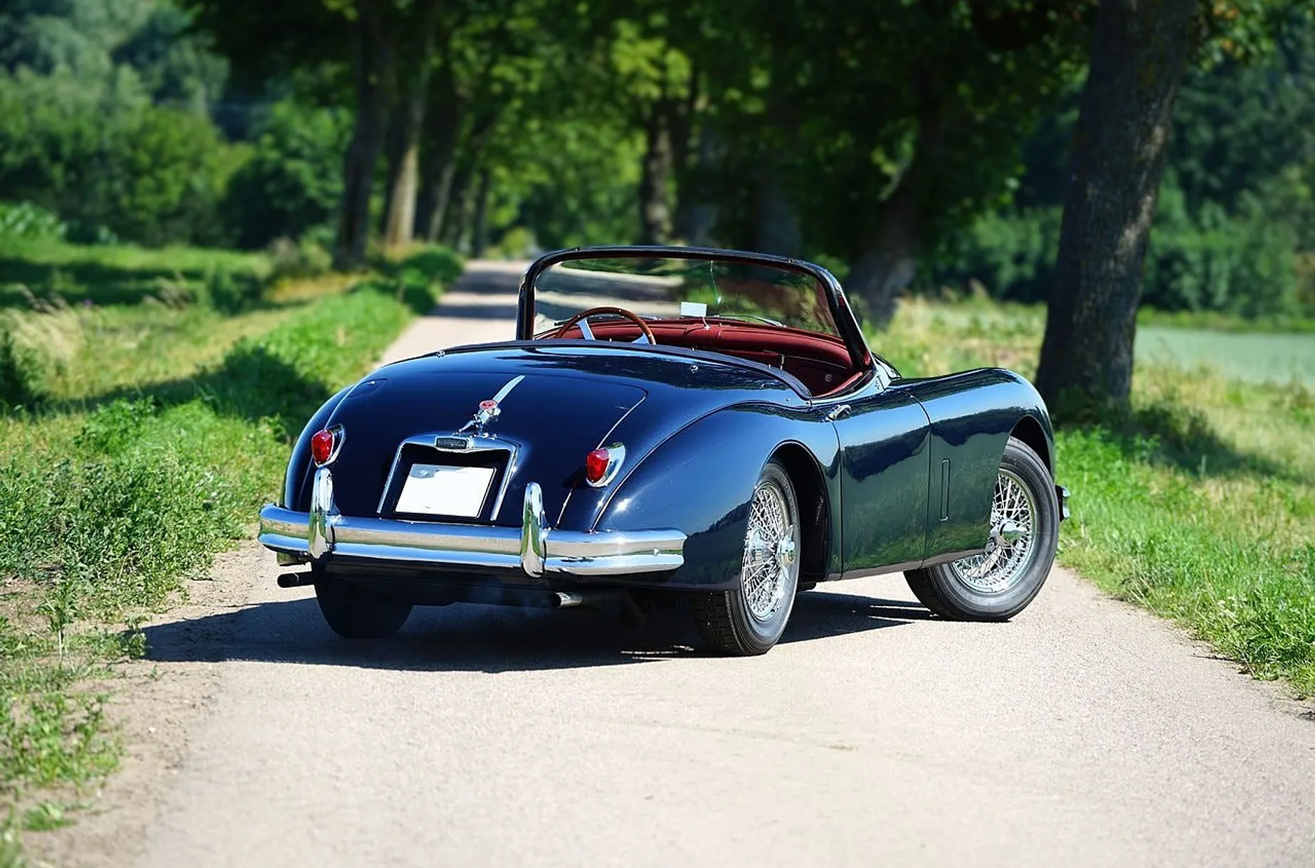 A Jaguar XK150 S is a very special machine. A “regular” Jaguar XK150 3.4L had 190 hp, or 210 hp in “Special Edition” form, while an XK150 S like this one had a full 250 hp. It is at its most beautiful—as here—in OTS (Open Two Seater) form when the top folds down behind the seats. Dark blue with red leather.