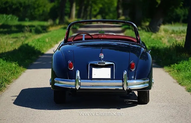 History: This is a very well-documented Jaguar XK150 3.4L OTS S. It has full ownership history in chronological order, with copies of the various titles showing where the car has been registered over the years. It comes with the original operating and service handbook, extra keys, and invoices for some of the recent work. To sum up: a very collectible Jaguar XK150 OTS offered for sale, which you would be taking over perhaps in the best possible state—not freshly restored, but used and tested, now performing as excellently as it looks. It is also a very rare model, arguably in the most beautiful shape and color combination. On 2020-04-23 it was registered and passed Technical Control in Sweden and comes with Swedish registration documents.