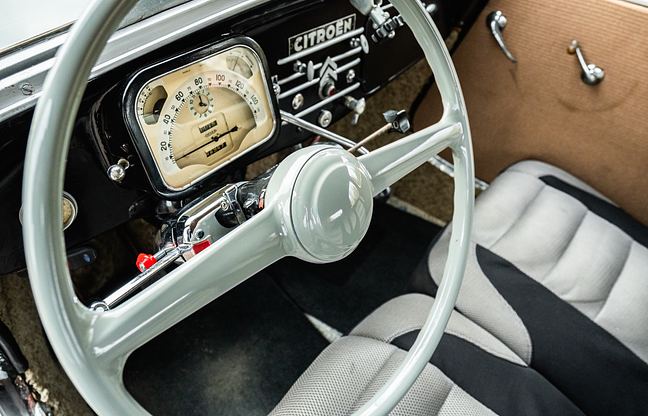 Några notabla detaljer är det ombyggda elsystemet till 12 V med modern generator, vilket underlättar drift och service jämfört med ursprungliga 6 voltssystemet. Bilen bär svart lack med hög glans och utstrålar tidsenligt uttryck. För entusiasten är detta en Citroën med spännande historik och kontinuerligt bevarad i nära originalutförande.
