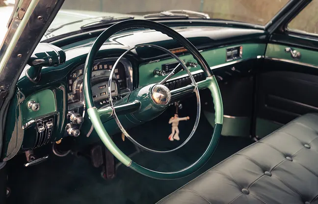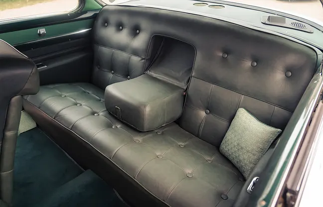 Interiör: Interiören uppges vara i nyskick. Sittdynor i grönt skinn, sidor och dörrsidor i vinyl i samma kulör. Innertaket är nytt. Ratten är renoverad och lackerad i korrekt kulör. Reglage och knappar är putsade och i presentabelt skick.