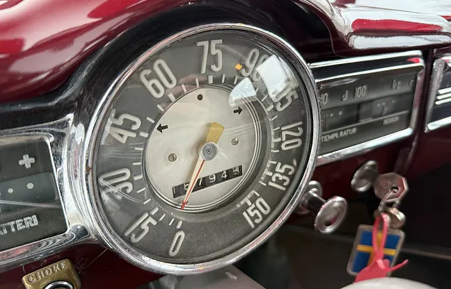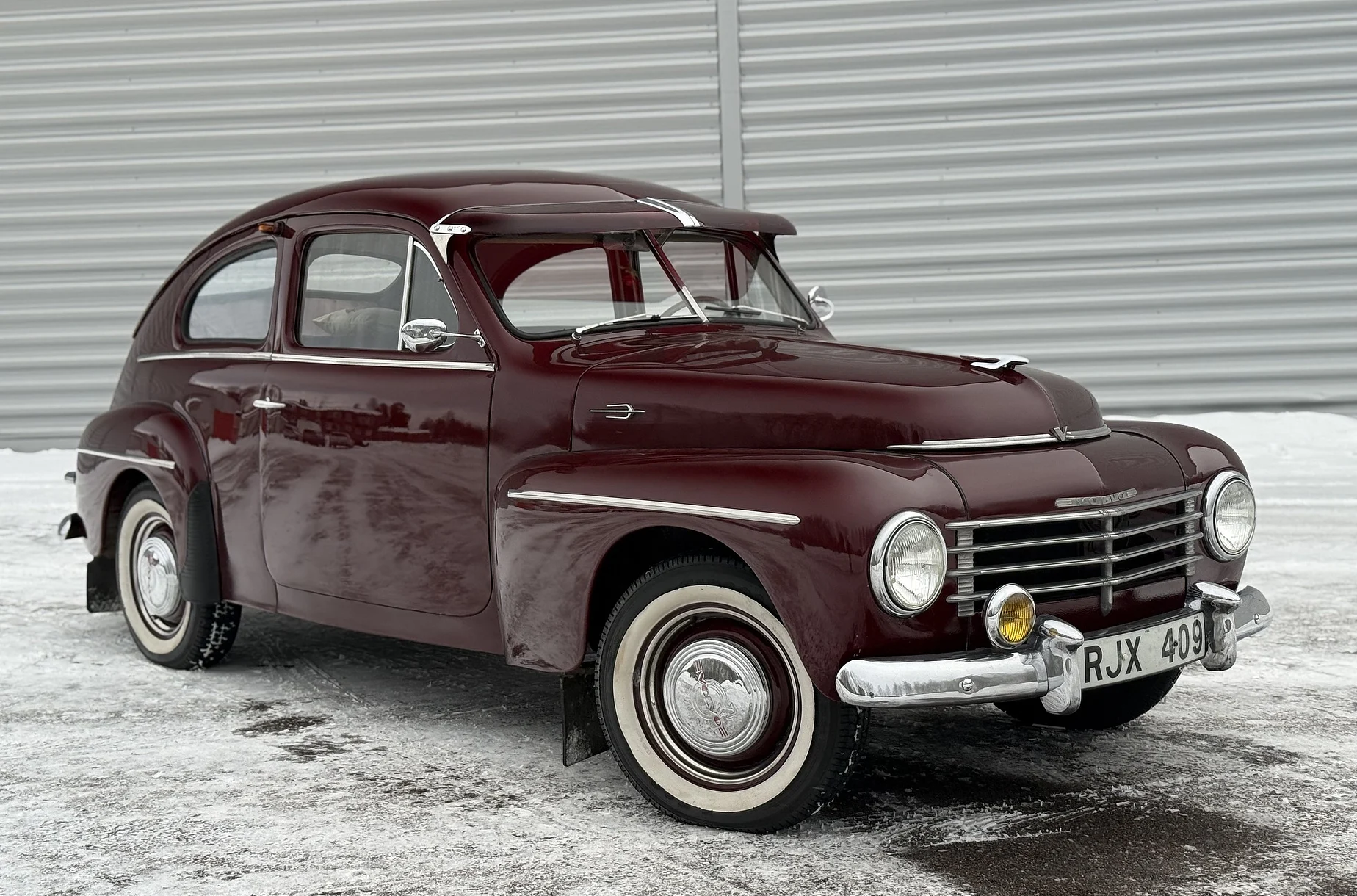 En Volvo PV444ES från 1953 i uppgivet originalutförande, med 1,4 liters bensinfyra, manuell 3-växlad låda och bakhjulsdrift. Bilen beskrivs som välvårdad med fin lack, bra krom och en hel interiör enligt säljaren. Mätarställning är 1 669 kilometer, och dokumentation uppges finnas i bilen. Uppgift om svensksåld saknas. Ett intressant exemplar för entusiasten som söker en tidig PV444 med bibehållen karaktär.