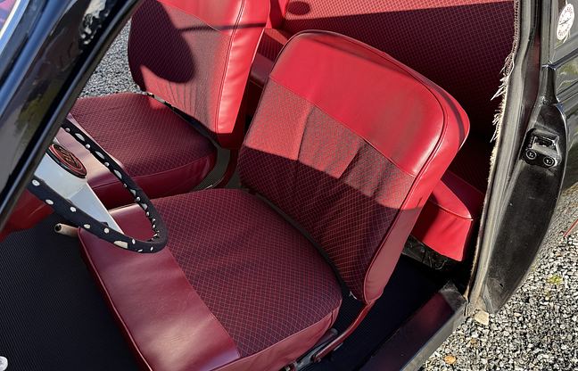 Interiör: Framstolar är renoverade, baksäte är helt original. Interiören har ett mycket fint använt skick. Inget att anmärka på innertaket, som är original utan skador. Ratt, reglage och knappar är i mycket bra skick, all funktion är bevarad. Instrumentpanelen har en mycket liten, knappt synbar spricka.