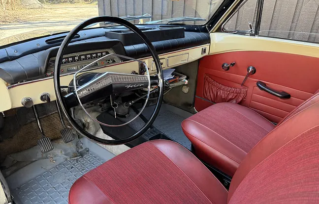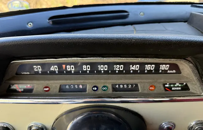 Interiör Interiören är bra med tanke på ålder. En söm har släppt cirka tio centimeter i ett säte, något som enligt säljaren bör vara enkelt att åtgärda. Instrumentpanelens ovankant har sprucken plast respektive fuskskinn efter uttorkning i solen. Ratt, reglage och knappar är överlag i bra skick, men några reglagens spakar har gått av. Innertaket bedöms som bra. Dörrpaneler och instegslister visar normalt åldersrelaterat slitage utan allvarliga skador.