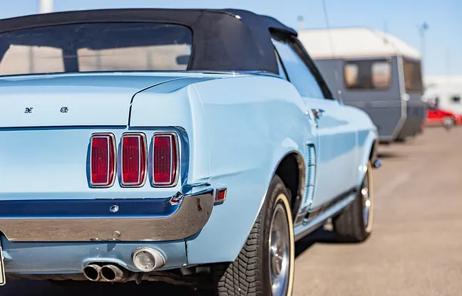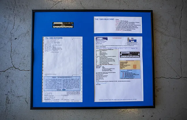 Importerad 1969 Ford Mustang i GT-utförande med FMX automat och svart cabriolettkapell. Bilen har äldre omlackering, synliga spår av tidigare rostlagningar samt i övrigt bra yttre detaljer. Interiören är fin för åldern med sprickor runt högtalargallret. Mekaniskt uppges bilen vara välfungerande med motorrenovering utförd 1981, fungerande bromsar och distinkta växlingar. Temperaturmätare och stereo fungerar inte. En omfattande dokumentationspärm medföljer och säljaren uppger att bilen är en dokumenterat äkta GT.