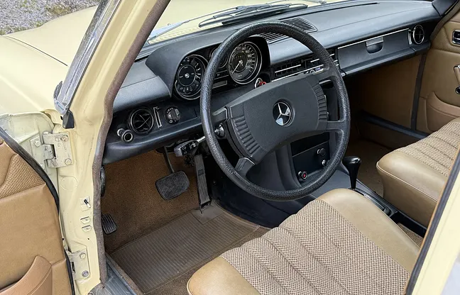 Detta exemplar är från 1974 och avser en W114 230.6, alltså en 2,3-liters radsexa (internbeteckning M180.954), med förgasare. Den uppgivna mätarställningen är 57 181 km och det är sannolikt att mätaren har varvat. Bilen ställdes på för första gången i Sverige 1981-02-20 och hade en ägare mellan 1985 och 2021, vilket kan förklara den sammantagna känslan av bevarad helhet. Bilen ska enligt uppgift vara svensksåld. Dokumentationen omfattar besiktningsprotokoll, Carfax och handbok. Övrig historik eller serviceunderlag saknas.