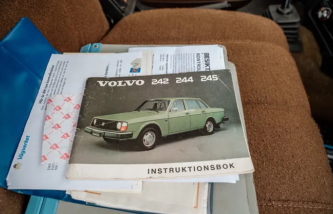 Uppgift om svensksåld status och antal tidigare ägare saknas. Serviceboken är enligt säljaren stämplad enligt intervall, senast den 1 juli 2025, men kvitton saknas. En tidig 242 med B21 tilltalar ofta entusiaster som söker en ren, analog körupplevelse med den klassiska rödmotorns karaktär.