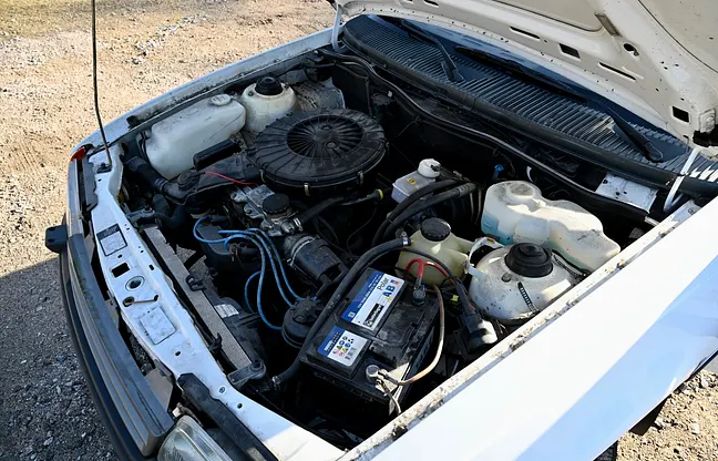 Mekanik och funktion: Motorn beskrivs som i fint skick. Kamrem och vattenpump bytta hösten 2024. Samtidigt byttes tändstift, fördelarlock, rotor, kylarvätska, luftfilter, motorolja och oljefilter. Bromssystemet är i bra skick, med höger bakre bromscylinder bytt hösten 2025. Växellåda och drivlina utan missljud vid senaste körning enligt säljaren.