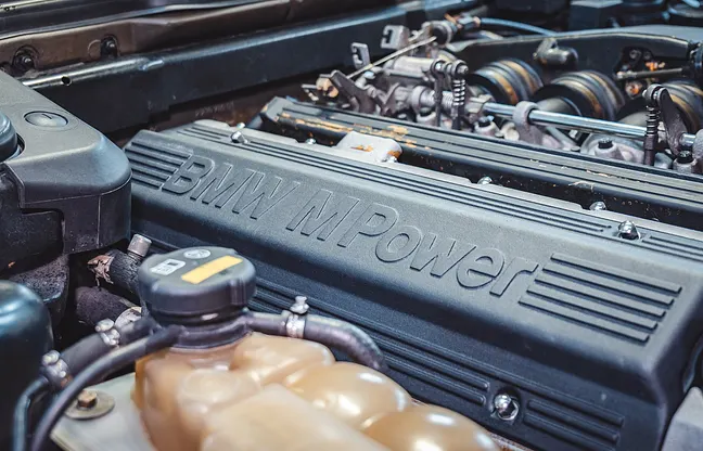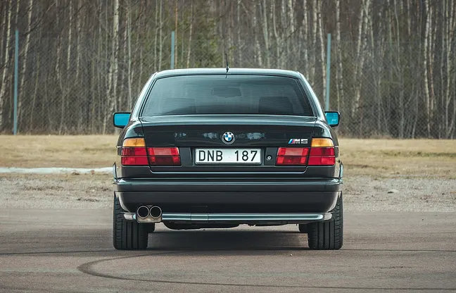 1992 BMW M5 3,8, import från Tyskland, med garanterad mätarställning och en rad fabriksval som Shadow-Line, stolsvärme, HiFi och elsoltak. Bilen är omlackerad i originalkulör och ger ett gott helhetsintryck med mindre anmärkningar som liten bula på huven, några stenskott, en mindre rostbubbla vid höger bakre dörrgång samt en repa i vindrutan nära synfältet. Interiören är välbevarad med begynnande skinnkrympning på dörrsidor och lätt släpp i innertakets tyg. Mekaniken beskrivs som sund, med färska vätskor, renoverad kardaninfästning och kontrollerat ventilspel, medan sekundärluftpumpen har obalans på grund av en skadad vinge.