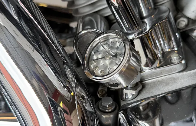 Kaross, lack och yttre detaljer: Enligt säljaren är lacken i mycket fint skick utan bucklor eller repor på tank eller skärmar. Det finns märken av grusstänk på kåpan mellan motorbågarna. Krom, lyktglas och emblem bedöms vara i mycket bra skick.