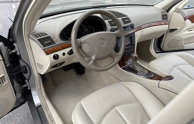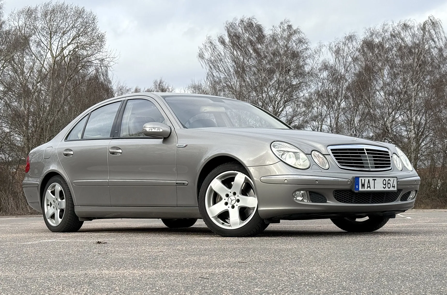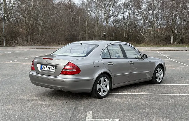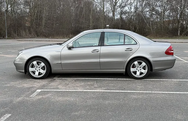 En Mercedes-Benz E 500 av årsmodell 2004 med V8-bensinmotor och automatväxellåda med låg mätarställning som kan garanteras, samt dokumenterad servicehistorik. Noterbara anmärkningar är en omlackerad sida efter nyckelrepa, fälgar med kantmärken, en mindre spricka i glaset vid klimatanläggningens reglage och en farthållare som ibland kopplar ur. Nya däck är monterade enligt säljaren.