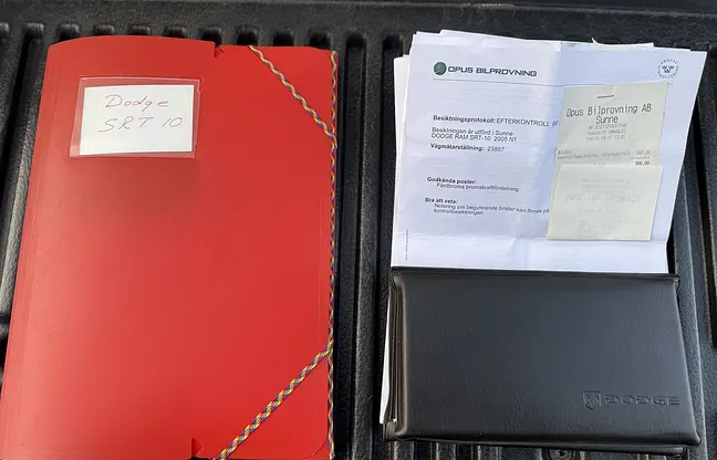 Dodge Ram SRT-10 från 2005 är muskelpickupen som tog Viper-receptet till lastbilsformat. Under huven sitter Vipers 8,3-liters V10 med cirka 507 hk och runt 712 Nm, kopplad till en 6-växlad Tremec manuell växellåda. Fabrikssiffror visar 0 till 100 km/h på runt 5 sekunder och toppfart nära 250 km/h. Chassit är sänkt från fabrik, bromsarna uppgraderade och bilen rullar på 22-tums hjul. För ett ännu bättre motorljud är ett Magnaflow-system installerad. Original medföljer. Det här är en modell som kombinerar amerikansk prestandamyts historia med praktisk kaross.