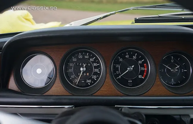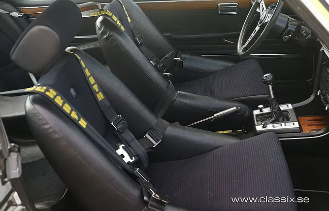 Exterior: This BMW E9 3.0 CSL is painted in the iconic and highly desirable Golf Yellow, a color that really makes the car stand out and provides great contrast to the CSL striping. In my opinion, while you can have a CSI in more subtle and elegant colors, a CSL should wear a bold color like this almost neon green. This particular CSL is in exceptional condition, having undergone a proper restoration that was completed in 2022. What makes the CSL different from a typical BMW E9 is hinted at in the name—L stands for lightweight. The car was factory-equipped with a thinner body and aluminum trunk, and doors. It also had fender flares, and the European models featured plastic bumpers or no bumpers at all, as opposed to the 500 UK cars, which came with standard chrome bumpers. The hood latch was also ditched and replaced with hood cotters. The body of this example is in excellent condition, no corrosion. All exterior chrome trim, and lights are in excellent condition. The car sits on original Alpina 14-inch wheels with new Michelin XWX tires.