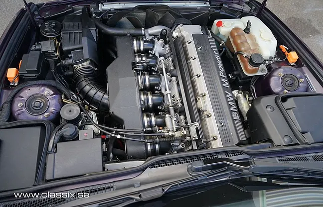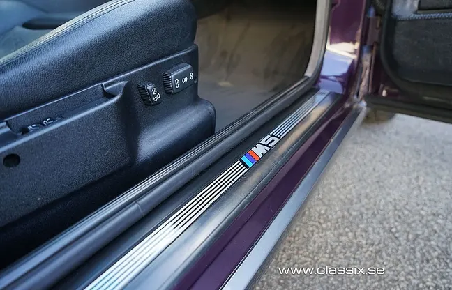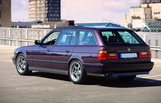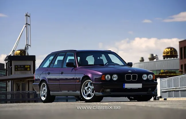 men vi söker nya bilar. Denna BMW M5 Touring (kombi) i den sällsynta och eftertraktade färgen Daytonaviolett (Daytonaviolett 283) hade en professionell omlackering runt 1999 och är i utmärkt skick. Färgen kompletteras av Granitsilber-detaljer och ikoniska BMW Throwing Star-fälgar med polerade kanter. Interiören är klädd i slitstarkt buffelläder och har ett dubbel soltak samt välskötta grå mattor. Motorn är en 3, 8-liters rak sexa med 340 hk, som hade en omfattande renovering 2007 vid 17.000 mil. Bilen, ursprungligen såld i Tyskland 1993, kom till Sverige 1999 och har sedan 2014 vårdats av nuvarande ägare.
