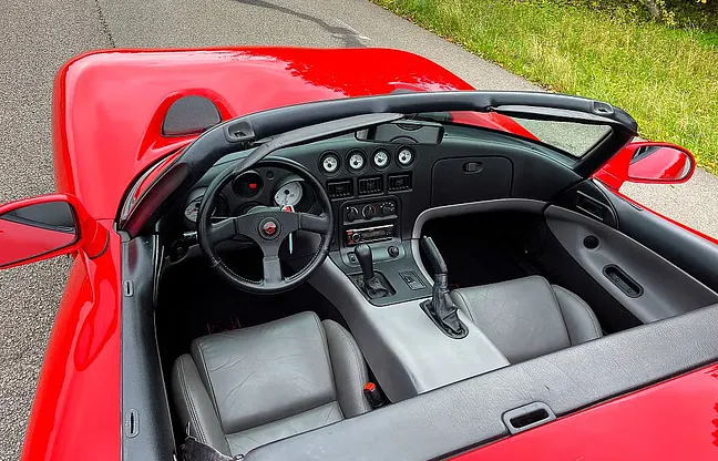 Den klassiska RT/10-karossen med sina avtagbara takpaneler ger en unik roadster-känsla och designen är lika brutal som den dag den rullade ut på vägen första gången. Interiören är spartansk men funktionell, med fokus på körning. Låg sittposition, rejäl växelspak och en instrumentpanel som talar samma språk som motorn – allt handlar om fart och kontroll.