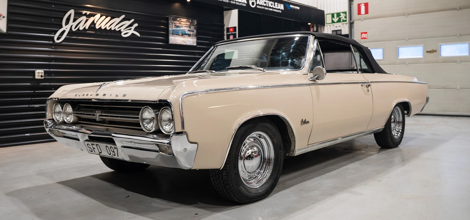 Samma år, men med ett något mer sofistikerat uttryck, hittar vi Mercury Montclair. Här möts 50-talets framtidstro och komfort i en hardtop-sedan utan B-stolpe, inspirerad av flygindustrins formspråk. Resultatet är en bil som kombinerar lyx, rymd och närvaro. Det här exemplaret är körklart och välbevarat, perfekt för den som vill uppleva klassisk amerikansk bilkultur utan att kompromissa med användbarhet. En bil som gör sig lika bra på bilträffen som på landsvägen.1964 Oldsmobile Cutlass Convertible – balans mellan stil och körbarhet