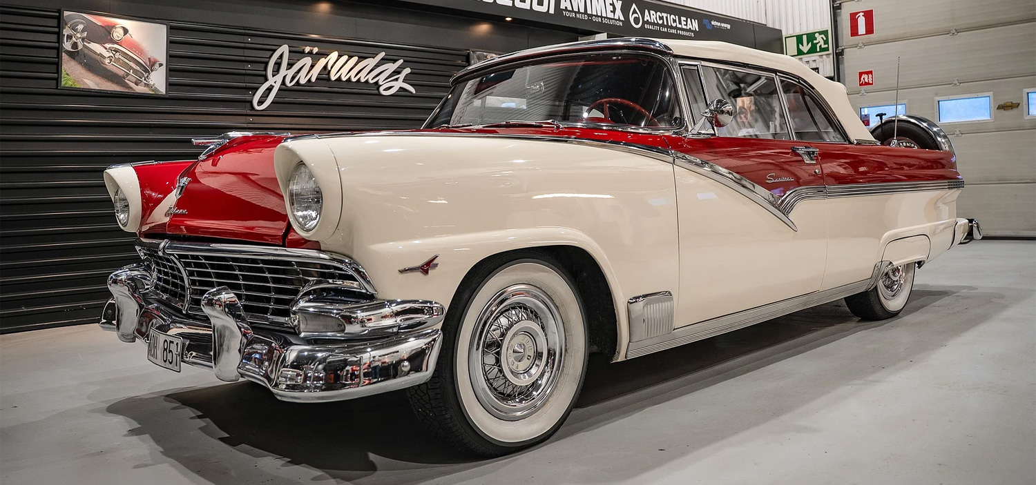 Den här samlingen visar inte bara olika modeller – den visar hur den amerikanska bilen förändrats över tid. Från 50-talets avslappnade cruising, där design och komfort stod i centrum, via 60-talets ökade fokus på körglädje och personlighet, till en tid då prestanda och teknik tog över huvudrollen. Varje bil nedan representerar sin egen era, sitt eget uttryck och sin egen idé om vad en riktigt bra bil ska vara.1956 Ford Fairlane Sunliner V8 – cruising när den är som bäst