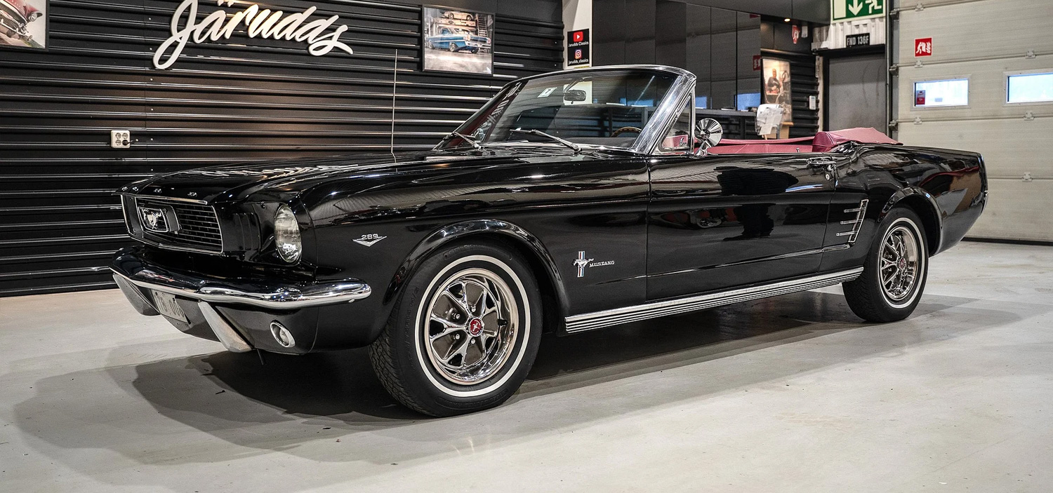 När vi kliver in i 1960-talet förändras uttrycket. Linjerna blir renare, proportionerna stramare och fokus flyttas mot körkänsla. Oldsmobile Cutlass är ett tydligt exempel på denna övergång. Elegant utan att bli överdriven, sportig utan att kännas aggressiv. Den här cabrioleten har genomgått en omfattande renovering och erbjuder en mycket fin helhet. Det är en bil som fungerar lika bra för lugna sommarkvällar som för längre turer – ett självklart steg mellan cruising och mer aktiv körning.1966 Ford Mustang Convertible – frihet för en ny generation