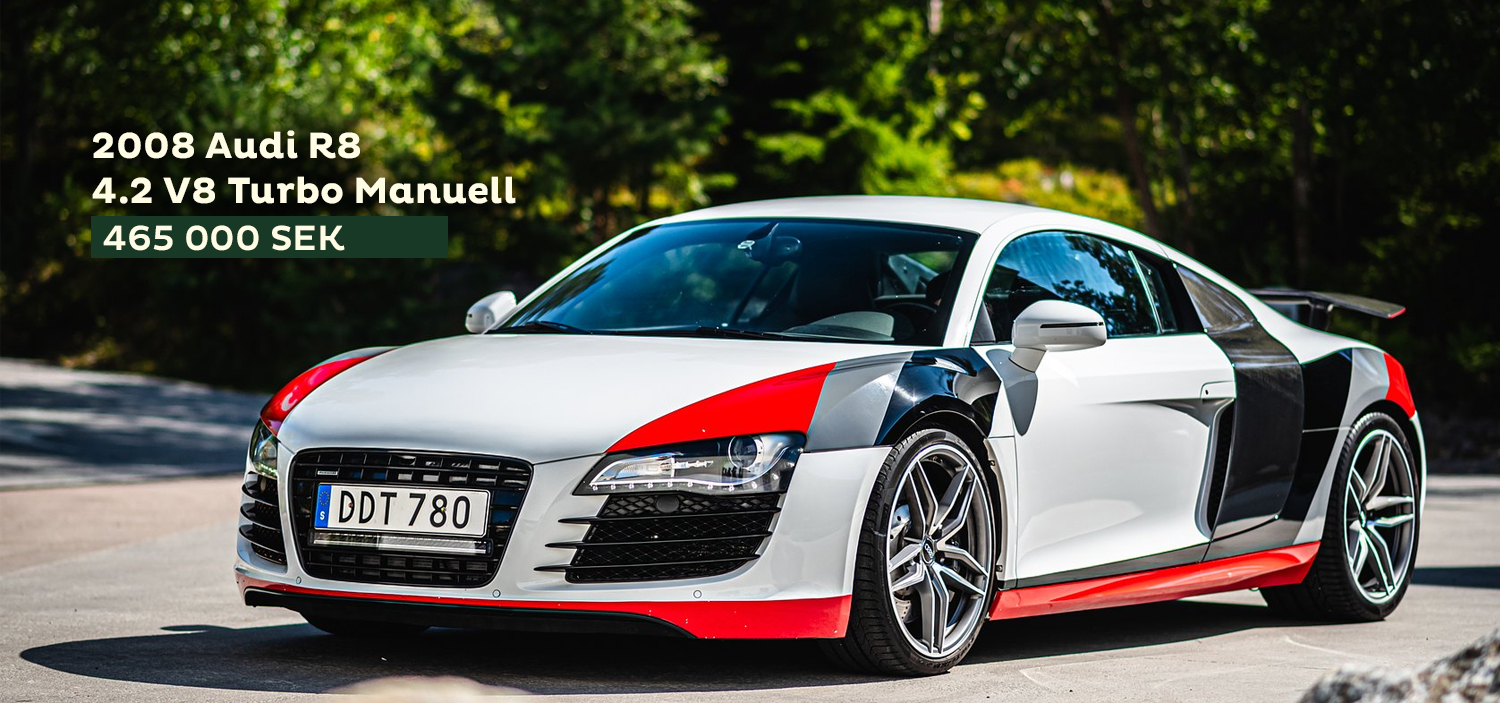 Denna M5:a vi sålde var något alldeles extra. Handbyggd, sexcylindrig och utan ett enda onödigt filter mellan föraren och vägen. Stark, äkta och med smak av 90-talets bästa ingenjörskonst. En M5 som påminner oss om varför tyskarna fortfarande leder ligan när det kommer till sport-sedanens ädla konst.Audi R8 – supersport på tyska